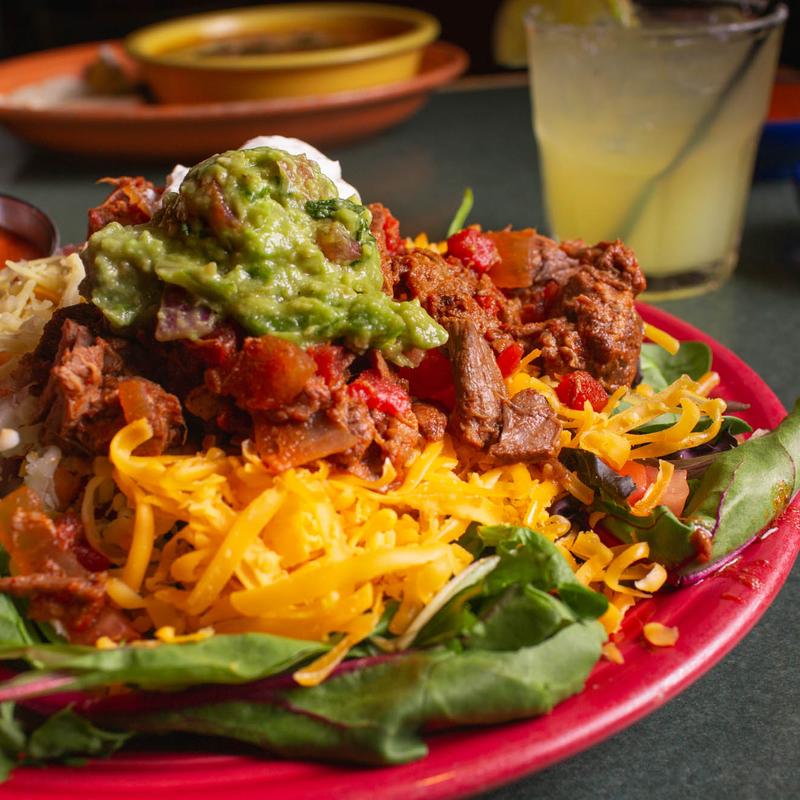 chicken or beef, fried flower tortilla, black beans, cheese, mixed greens, black olives, red onions, jalapenos, sour cream, guacamole, salsa