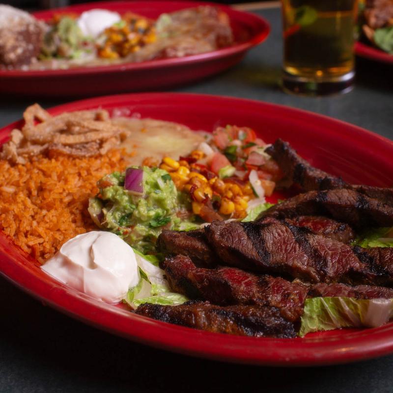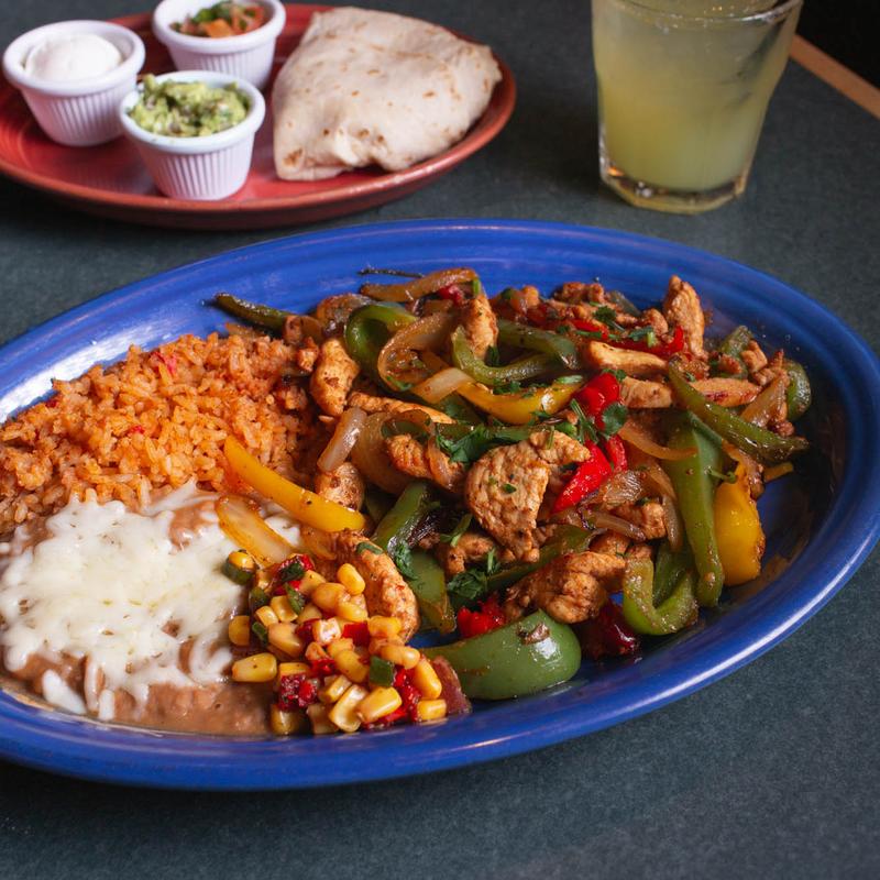 Chicken $19 | Steak $21 | Shrimp $20 | Veggie $18 | • sautéed tri-colored peppers and onions, with rice, beans, guacamole, sour cream, pico de gallo, flour tortillas