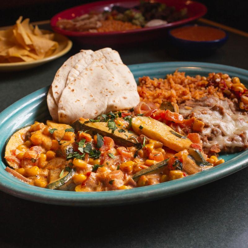 zucchini, corn, red onion, tomatoes, red chile and cilantro, sautéed, served with jalapeño crema, rice, beans and tortillas